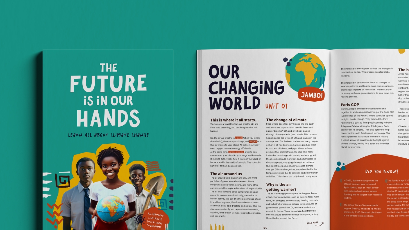 Een ander belangrijk hoofdstuk in onze samenwerking kwam tot leven in de vorm van een bijzonder lesboek, wat we zowel in het Engels maar ook in het Swahili hebben geleverd. Een kleurrijke en interactieve publicatie waarmee kinderen op een laagdrempelige en speelse manier leren. Geen statisch boek, maar een visueel en inhoudelijk rijk document dat uitnodigt om mee aan de slag te gaan.